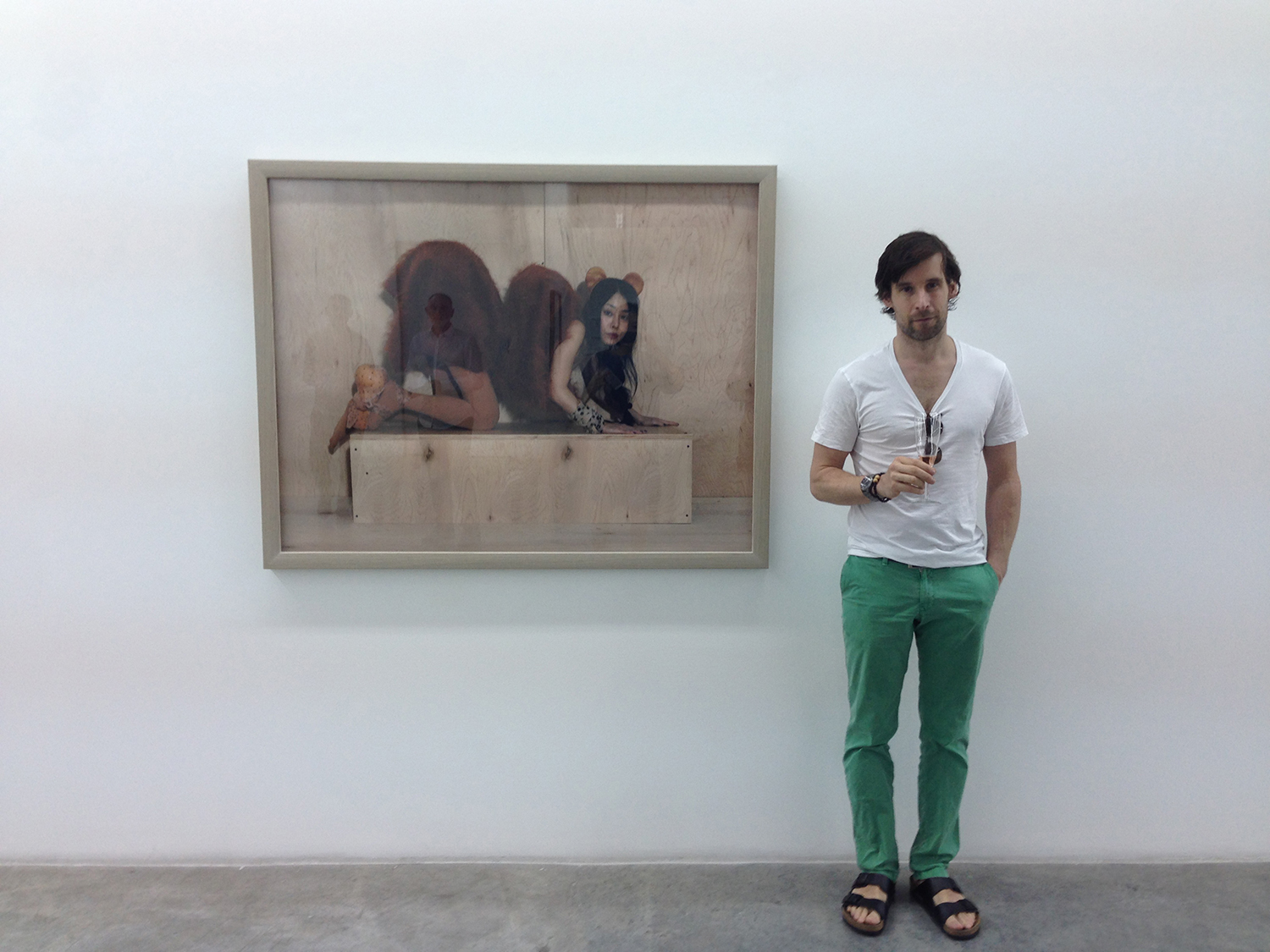 In 2013, my gallery in Dubai, Carbon12, invited me for a solo show. It was my motivation to create something, especially for Dubai. I had never been to the Middle East before and had just some naive ideas about how it would be there. I assumed there would be sand, camels, and overdressed women for religious reasons. I named the series of photographs I planned to do Camelops Femina. At my New York studio, I invited a few of my friends to model for me. I built a stage out of sand-colored natural wood and bought many clothes in more or less the same color tone. The models had to go on all fours and pretend to be camels. I was happy with the end product but worried that the gallery visitors in Dubai would not have enough humor and I would end up in trouble. While creating this work, I realized that I push the envelope, which I often do with my art. I feel an artist should have the liberty to talk sometimes unpleasantly without hurting someone’s feelings, provided that this person has enough humor to recognize the nuances of the artwork. But all went fine, and as you can see in the photo below, I was drinking champagne without any worries.