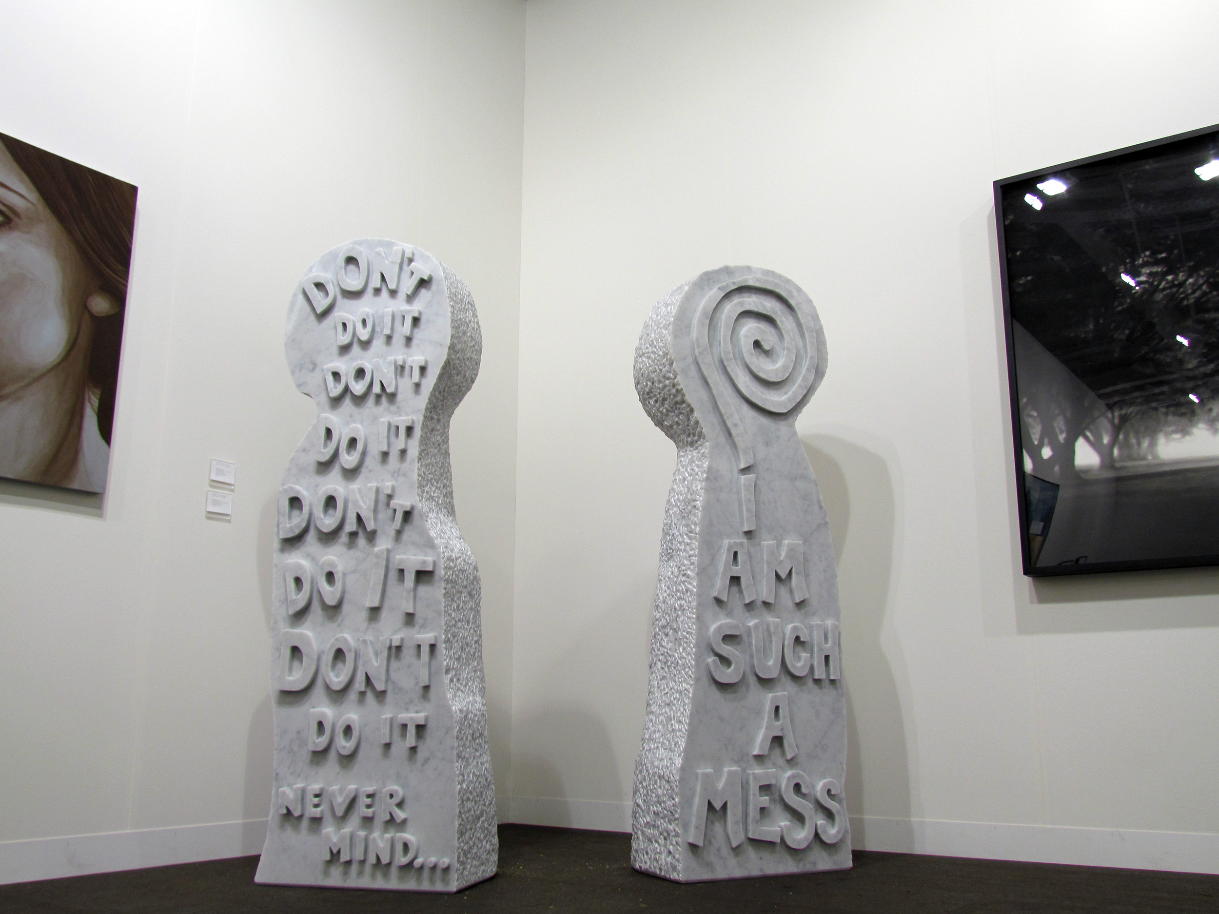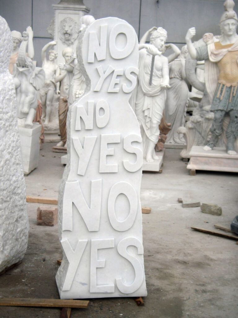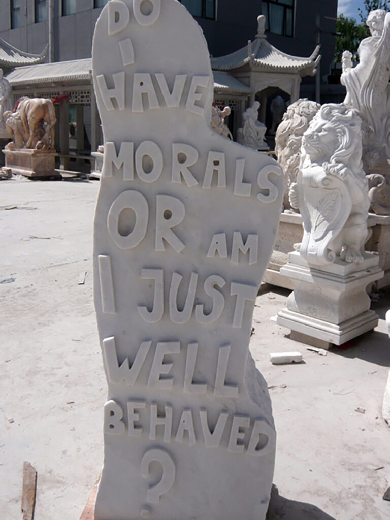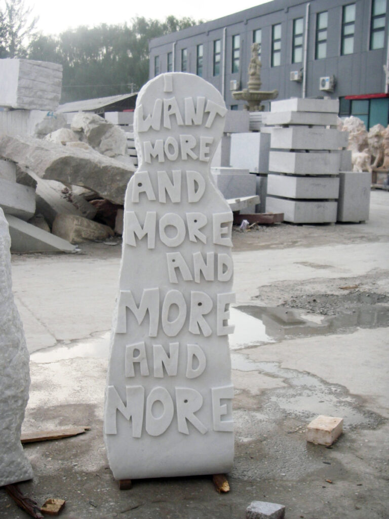 They look like gravestones, like human bodies, and they have a message to tell. As we know, something “written in stone” is permanent and can not be changed. I thought it was interesting to have simple, random thoughts about “life” carved onto marble. These creature-looking stones feel like personalities repeating the same message for a very long time to come. The seriousness of the material, combined with the lightness of the thoughts, results in a permanent strangeness, which interests me very much. I like it when artworks vibrate in a state of uncertainty. Plus, there are some conclusions about our world with an undeniable truth. Of course, people usually share those thoughts on Facebook and don’t carve them in stone.