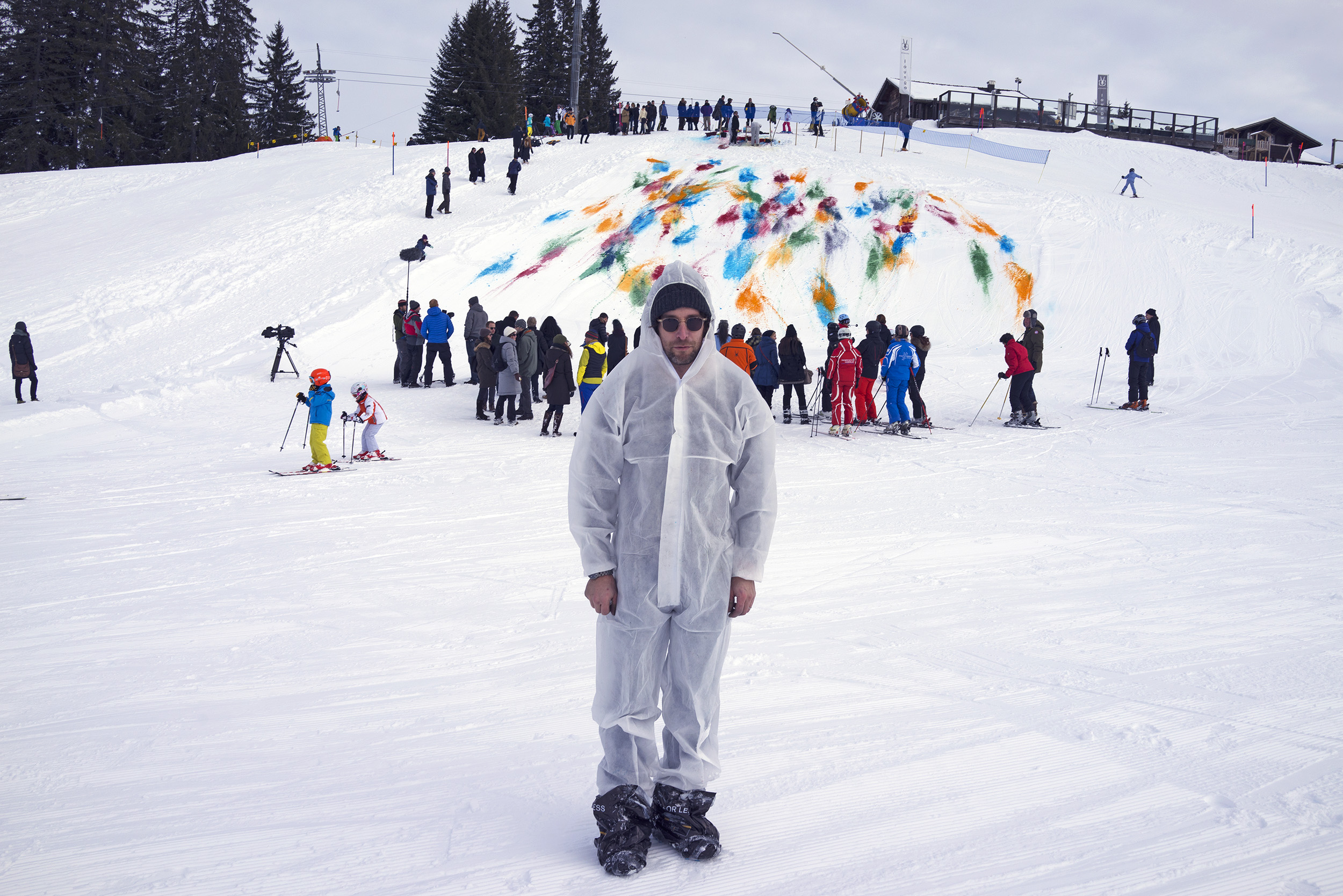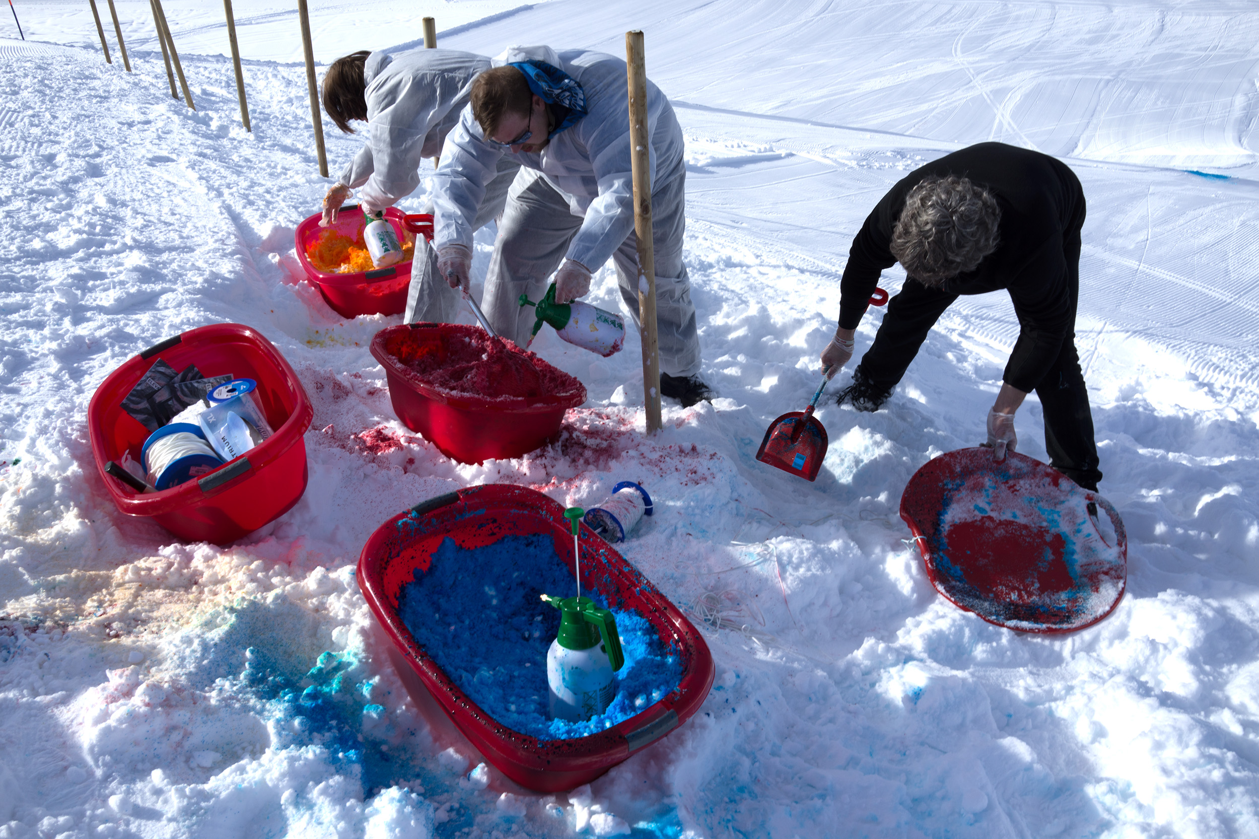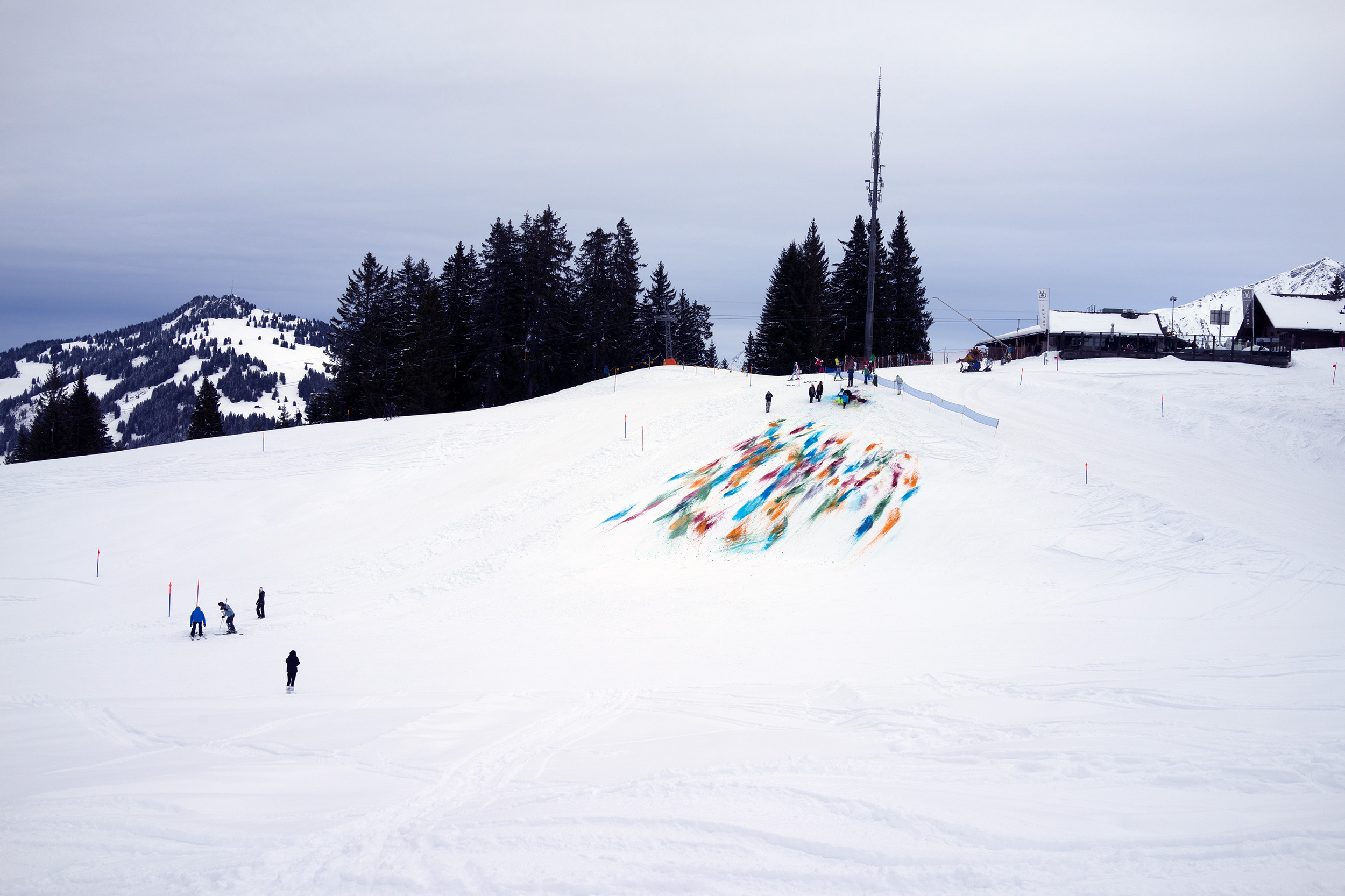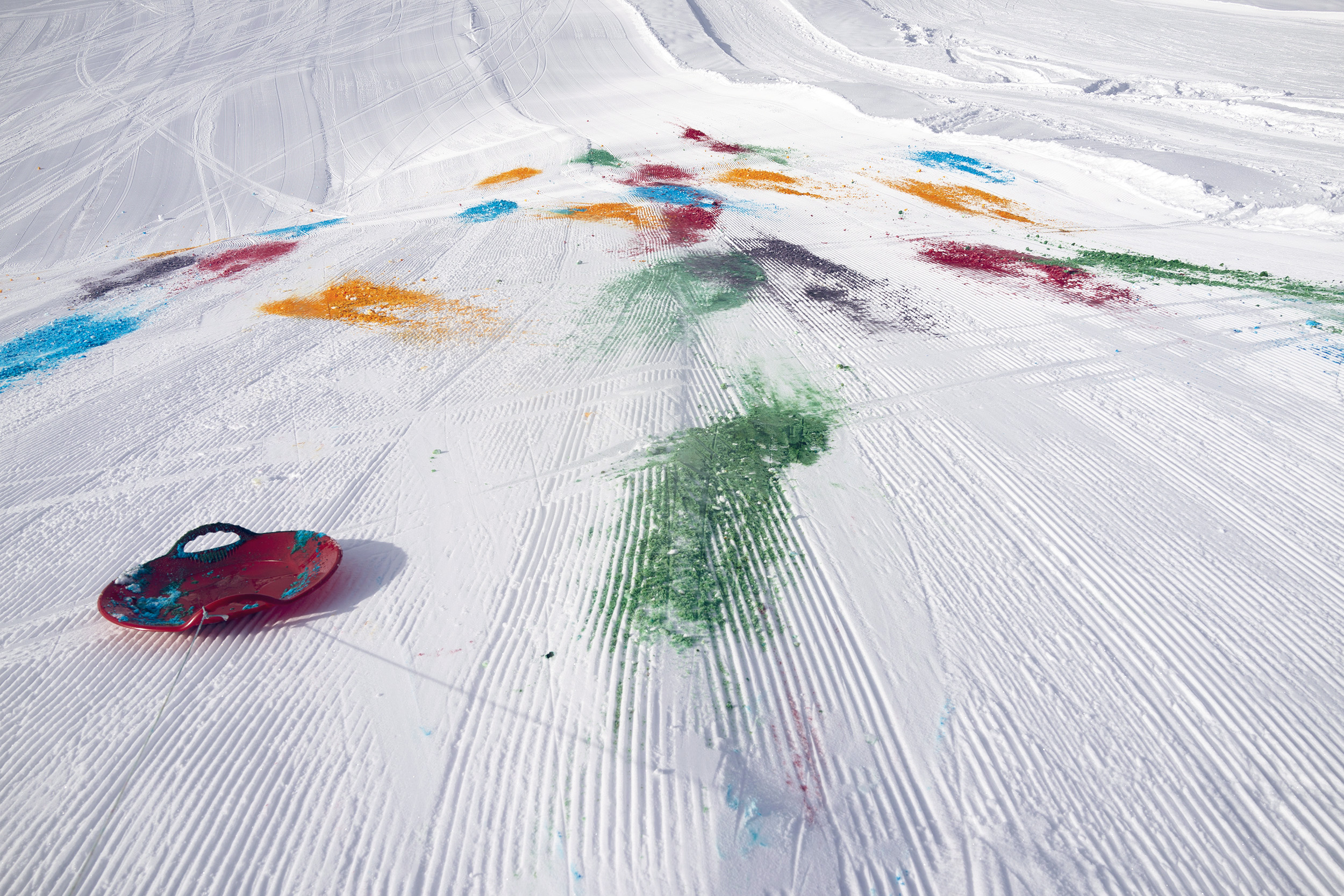 2014 I was invited by Olympia Scarry and Neville Wakefield to take part in the show they curated called Elevation 1049. I decided to make a performance/snow drawing. The idea was to color a part of a ski slope with patches of food colors to make a large snow drawing. Once the drawing was finished, the skiers would distribute the colors into a more abstract painting. Unfortunately, I don’t have any images of the later stage of the snow drawing. Sometimes, artists forget to document their works. It did not matter to me; it was essential to be there and create the painting. It was a lot of fun.